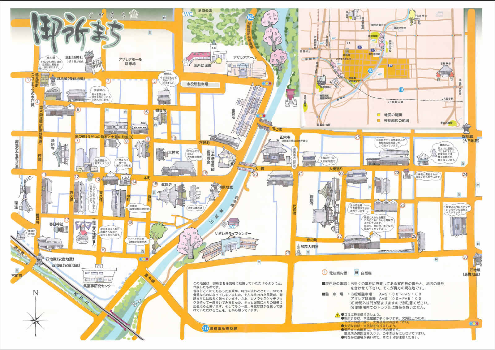 概 況 古地図の街並みが今も残る、日本風景街道御所まち、商家が軒を連ねる商業のまち