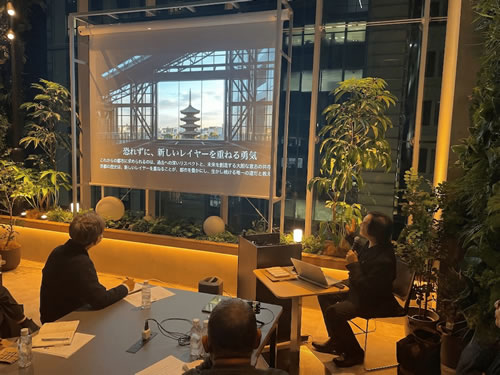 など多岐にわたるもので、普遍的な問題提起や創作現場への示唆に富む視点でもあり、特に歴史的なイメージは再編されたものであって固定的に冷凍するべきものではないとの講師の主張が明快でした。その後の質疑では、講演内容に沿って小梶会長含むベテラン設計キャリアの会員他から、京都のクライアントや行政・住民のユニークな点など忌憚のない意見交換が行われ、充実したセミナーになりました。